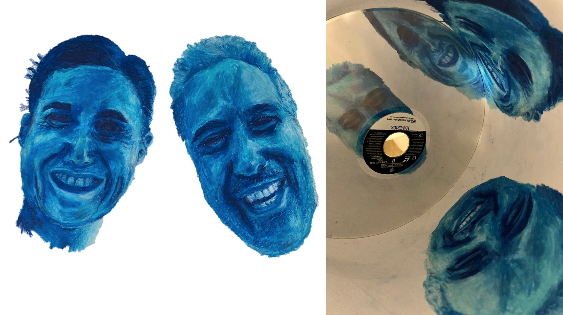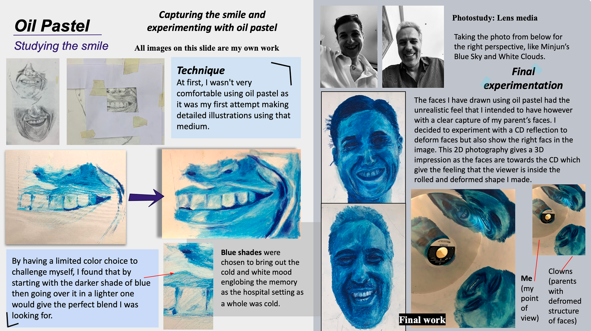 After waking up under anesthesia in a hospital bed, I still remember the image of my parents as clowns smiling down at me when I was 3 years old. This piece communicates a captured moment where familiar faces changed in a strange way. The act of my parents smiling in joy is contrasted with the feeling I had when seeing them differently. My choice of using this textured medium, the color blue, and the representation of clown faces in my own way, all support the emotions that carried this memory.