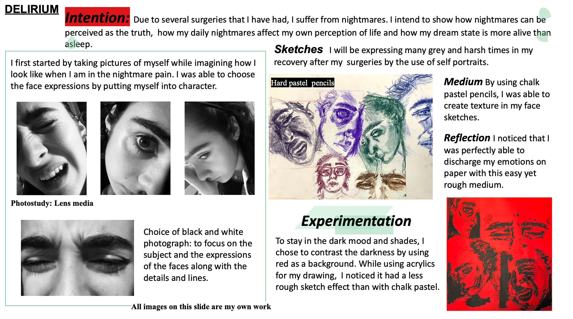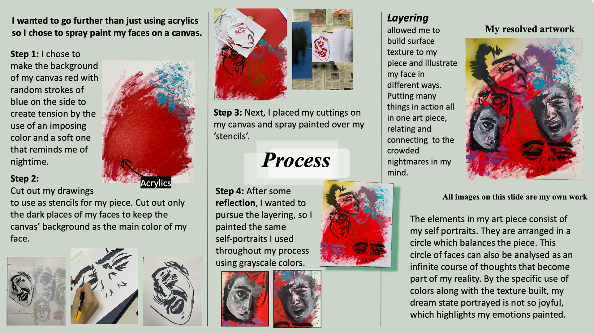 Throughout my life, I have experienced a plethora of surgeries that have resulted traumatic experiences that have been embedded in my memories creating inevitable nightmares. I was able to portray my silenced feelings by layering mediums to convey the paces of my nightmares. The choice of colors reflect these powerful moments as I convey the different stages of one's trauma. I strive that people could relate to the same cycles of torment caused by distressing events. The elements in my art piece consist of my self portraits. They are arranged in a circle which balances the piece. This circle of faces can also be analyzed as an infinite course of thoughts that become part of my reality. Layering allowed me to build surface texture to my piece and illustrate my face in different ways. Putting many things in action all in one art piece, relates and connects to the crowded nightmares in my mind.